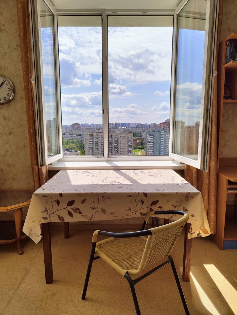 Окна строго на ЮГ, не на улицу и не к соседям ! ВСЕГДА из окон ТОЛЬКО свежий воздух и НИКАКИХ выхлопных газов, аллергенов и насекомых (они НЕ долетают до 15 этажа), на высоте шум машин не беспокоит, можно принимать ВОЗДУШНЫЕ ВАННЫ лёжа в кровати.